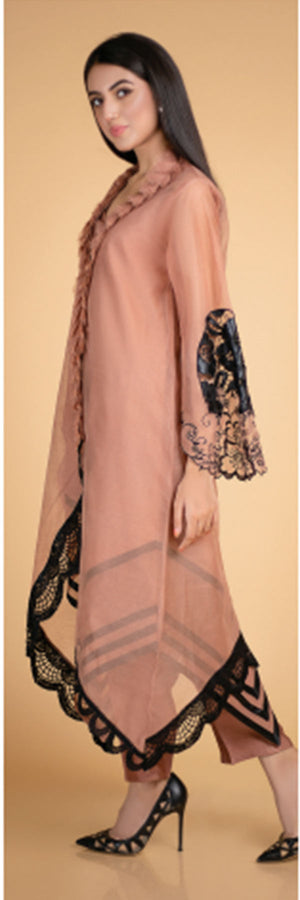 The absolute go-to for any occasion. This asymmetric layered jacket is simple yet impactful, a true head turner! The sleeves are individually hand crafted with a leather effect floral embroidered motive to give the sleeves a wow factor. The soft textured organza fabric has been alone in a rose gold and off white,with monochrome embroideries.Fabric: Organza