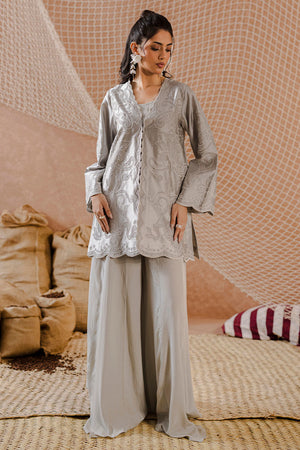 A loose-fit steel grey sheesha silk jacket with tonal embroidery and khaddi silk appliqué for subtle textural contrast. The set is paired with crepe palazzo pants, completing a fluid and modern silhouette.