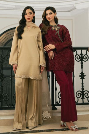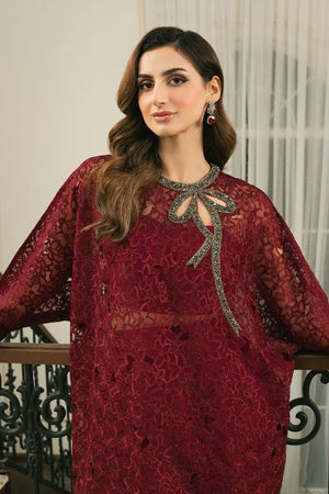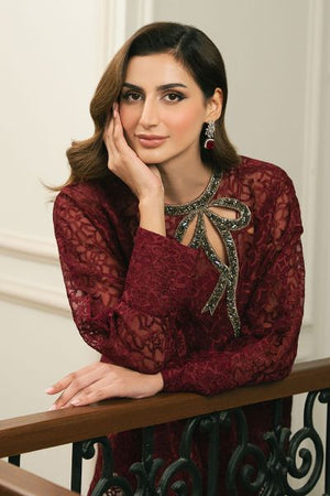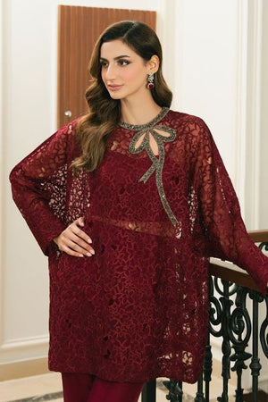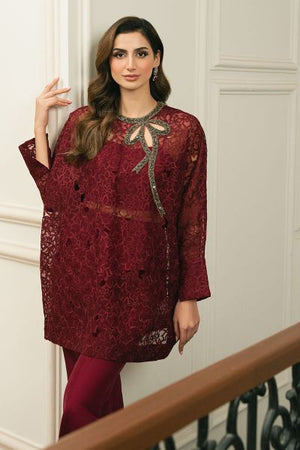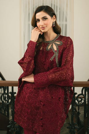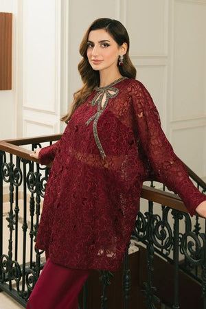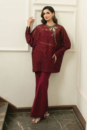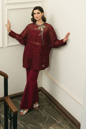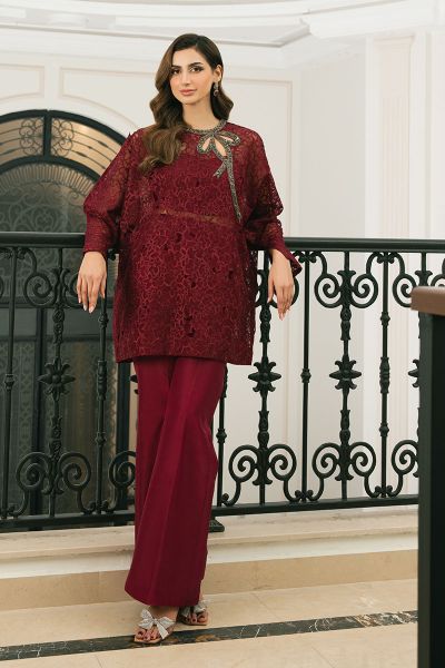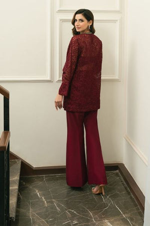 This sophisticated burgundy ensemble effortlessly blends classic and chic style .make a statement with this stunning ensemble featuring a boxy, embroidered shirt boasting intricate handwork and a striking neckline. Pair it with sleek bootcut pants for a chic, fashion-forward look that exudes elegance and sophistication