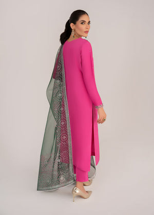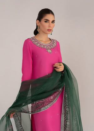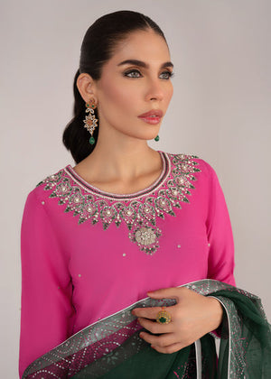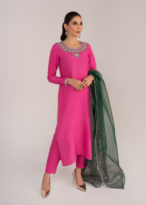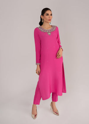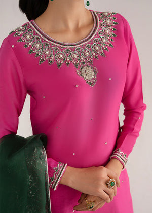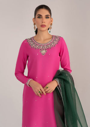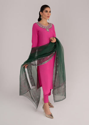 An absolute Regal pink Silk set with embellishments in the front of nakshi, dabka, sitara, and cutdana in Contrast color. Paired with matching ftitted pants. Contrast Organza Dupatta added with block print borders in chunri Style to complete the look. A perfect party wear for both and evening events.