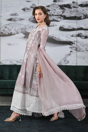 A graceful light mauve long shirt, beautifully adorned with white print and a delicate lace border, complemented by fitted sleeves for a refined silhouette. Paired with a pristine white izaar and a luxurious mauve silk dupatta, finished with lace borders.
