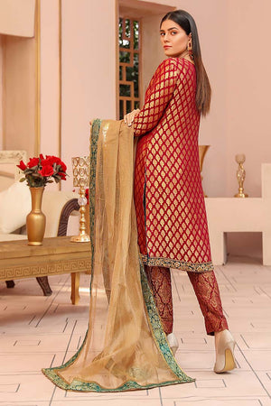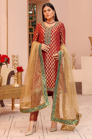 Evoke a sense of magnificence & refined elegance in our ensemble “Marigold” - classic straight cut silhouette on gorgeous maroon pure chiffon jamawar with heavily embellished handwork on a classic round neckline. Beautifully paired with pure self silk tapered pants and intricately embellished pure net dupatta.