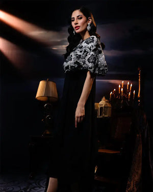 A Flowy pleated dress draped in assymetric lengths paired with a cutwork detachable capalet.