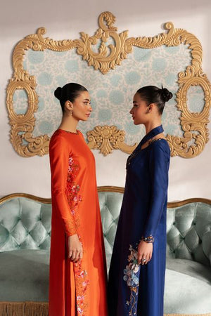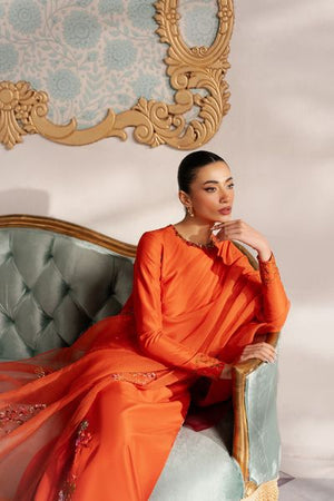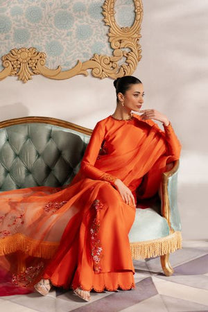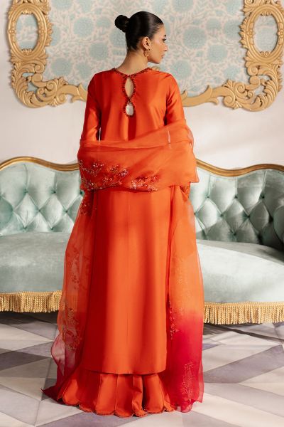 This rust-colored outfit combines richgold embellishments with delicate floral motifs in blush, peach, and ivory, creating a striking yet graceful design. The shirt is paired with elegant sharara pants, featuring a scalloped edge for added movement and sophistication. A beautifully patterned dupatta completes the look, echoing the shirt's intricate details. Perfect for any festive occasion, this ensemble blends traditional charm with modern elegance