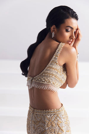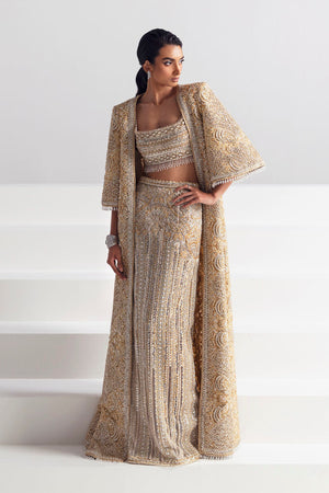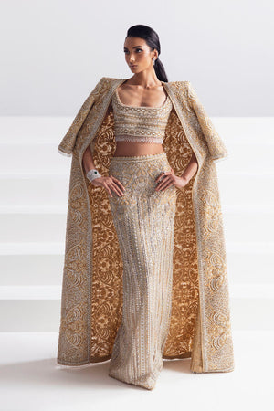 Prepare to make a grand entrance in an ensemble that perfectly marries extravagance with sleek sophistication. At the heart of this show-stopping outfit is the embellished jacket, a true masterpiece that commands attention and exudes opulence. The jacket is adorned with intricate embellishments that catch the light with every movement and takes center stage. Its luxurious fabric shimmers and glimmers, creating a mesmerizing play of textures and tones. The jacket drapes gracefully, creating an aura of regal elegance as it envelopes the wearer. Adding a contemporary twist to classic elegance, the skirt complements the jacket flawlessly. The skirt's unique silhouette accentuates curves while allowing for easy mobility, making a statement that is both bold and refined. This outfit redefines modern chic, seamlessly blending tradition with contemporary flair. Every element, from the dazzling jacket to the form fitting skirt and the lavish embellishments on the blouse, comes together in perfect harmony. You become the embodiment of elegance, confidence, and a fearless sense of style that captivates all who behold you.