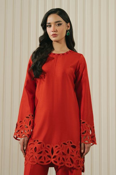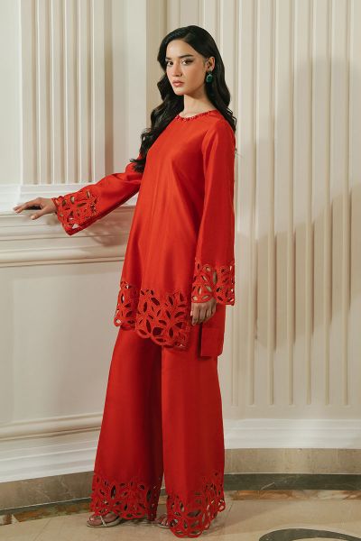 This striking rust-colored outfit is a modern fusion of elegance and bold design. The short shirt features intricate cutwork details, creating a delicate yet daring pattern that adds texture and visual interest to the fabric. The beautifully crafted cutlines throughout the shirt enhance its contemporary appeal, making it a standout piece. Paired with baggy trousers, the outfit offers a relaxed yet chic silhouette, perfectly balancing the boldness of the cutwork with a comfortable, effortless style. The overall design is sleek and sophisticated, making it an ideal choice for someone looking to make a stylish statement with a touch of artistic craftsmanship.