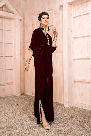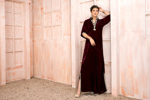 | •Fabric :Fully embroidered neckline on 9000 micro velvet •Details:Fully Embroidered neckline with heavy tilla embroidered sleeves, • Length: Length is 56" for all sizes Available in Ready to Wear only. |