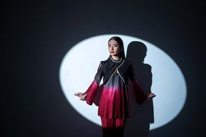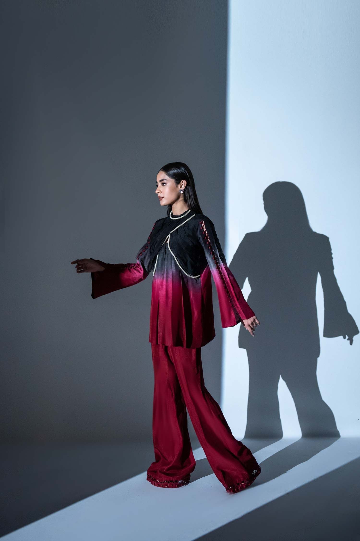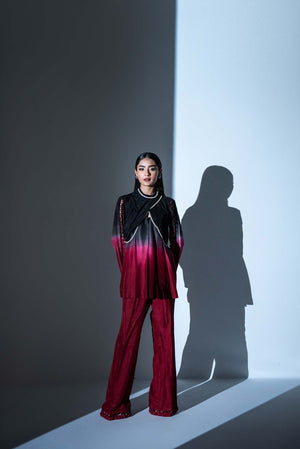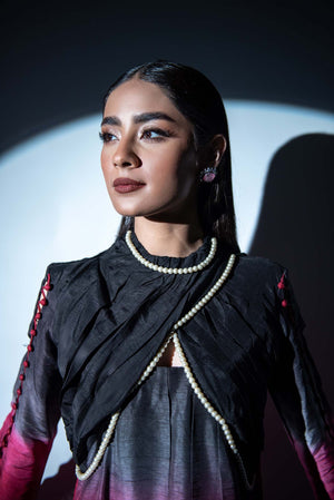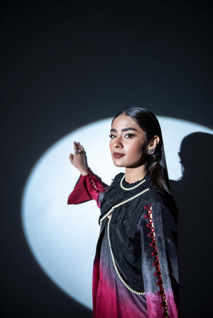 Make a stylish impact at your next festive gathering with our Maroon Ombre Twist outfit. Crafted from the softest raw silk in a stunning black and maroon ombre, this luxurious piece features a twisted neckline and faux pearl hangings like a necklace, adding an extra touch of glamour to your look. Whether you're attending a formal or casual event, this outfit is the perfect blend of comfort and sophistication. So why wait? Indulge in the ultimate in luxury and style Note: For length and sleeve customization, please drop a message on our socials.