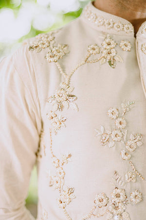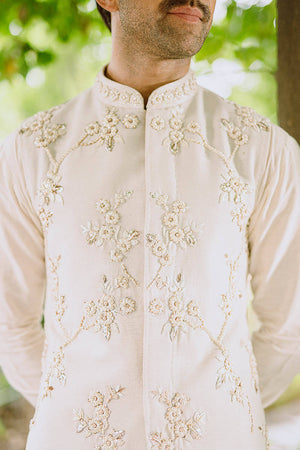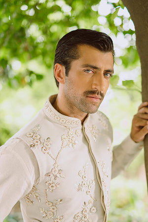 Aimal wears Marzook. A pure white silk canvas is hand rendered with matching silkfloss and stitched into a slim fit waistcoat. Worn with tailored pants and our signature short kurta.The shipping charges for all articles barring Bridals are as follows: