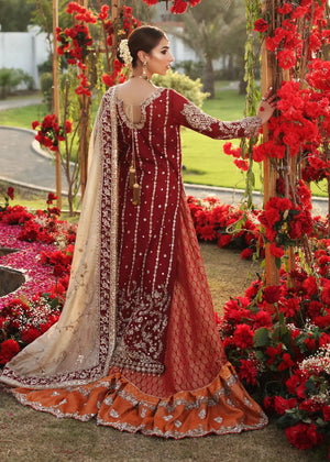 Maroon with gold dupatta. This hand crafted maroon bridal outfit features an array of elegance and glamour. The ensemble is beautifully hand emballished with Dabka, Resham, Semi preciouse stones and hand cut sequins. It is paired with kamkhab sharara and Gold tissue dupatta with hand emballished border and floral motif all over.The shipping charges for all articles barring Bridals are as follows: