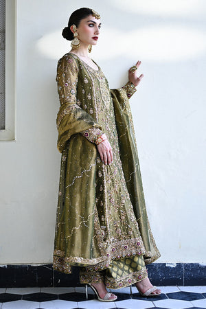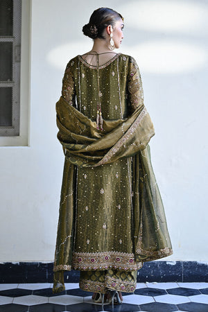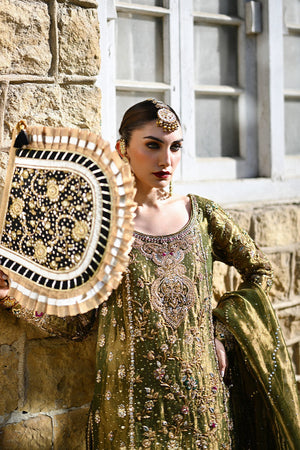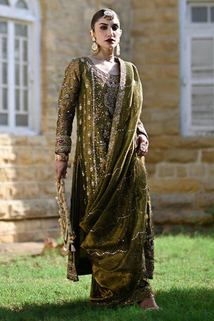 An elegant blend of olive green and bronze gold tones, this straight-cut shirt is richly adorned with intricate zardozi, dabka, gota, sequins, cutdana, and resham work. The embellishment dances across the neckline, sleeves, and hemline in traditional floral and paisley motifs, offering a regal yet refined aesthetic. Paired with a hand-embroidered izaar featuring complementing detailing along the cuffs, the ensemble is completed with a shimmering gold lama dupatta, edged with embellished borders that add texture and opulence.