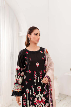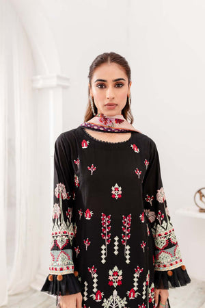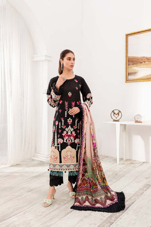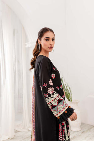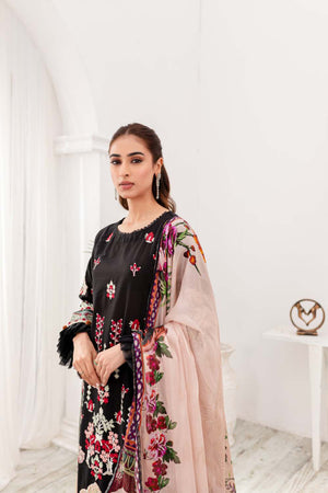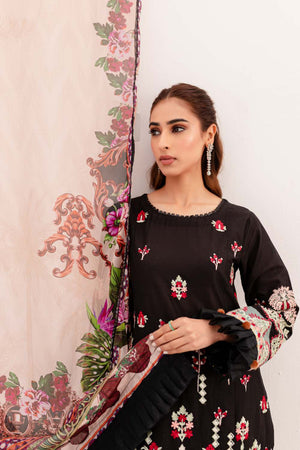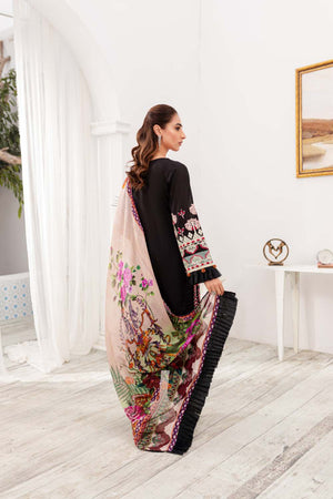 â¢Details: A charcoal black lawn base features intricate and delicately embroidered floral imagery in shades of pink, sage green, and ivory Paired with a medium silk painterly printed dupatta with abstract imagery and floral vines. A matching completes the look