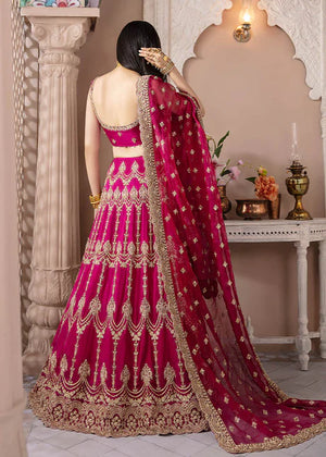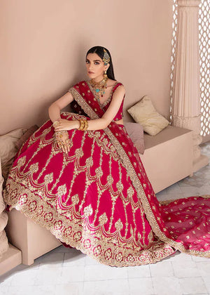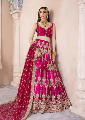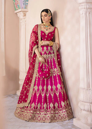 In a sparkling pink hue, Mayal is an ultimate spotlight in modern festivities. Crafted on a Korean raw silk choli with sumptuous gold embellishments, which is surfaced over luxuriously hand embellished lehnga, with elegant jewel like motifs. To complete the look, it is designed with minimal yet chic gold sequin spray and lavish bordered dupatta.