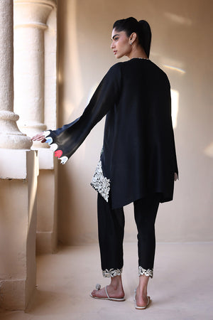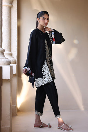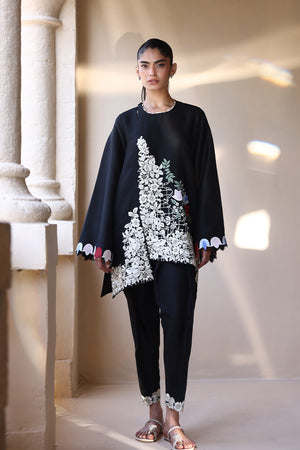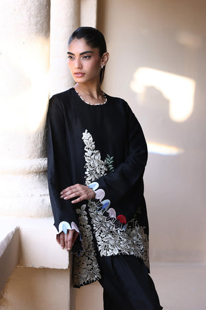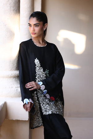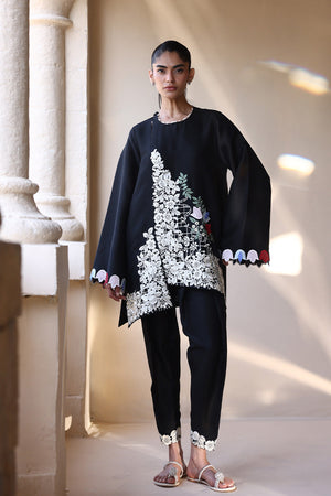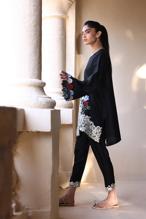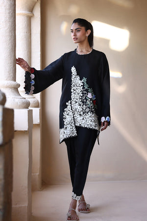 A deep ebony hued ensemble crafted from pure rawsilk features a statement asymmetrical shirt embroidered with ivory florals, accented by lush green foliage and vivid crimson blooms. A black tapered shalwar highlighted by a delicate hem detailing completes the look.