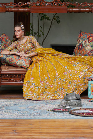 Introducing our 'Mehek Lehenga Choli' a vision of grace and grandeur. The enchanting mustard lehenga choli is a perfect fusion of traditional charm and contemporary style. The contrasting machine embroidery beautifully intertwines with intricate pita work, dabka, naqshi, Swarovski stones, and cut beads, creating a mesmerizing ensemble that will make heads turn. The breathtaking dupatta is adorned with a captivating kamdani jaal, and the heavily embellished borders add a regal touch to the outfit.