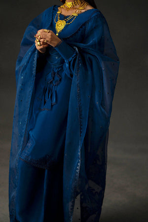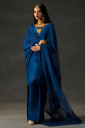 Meher Bano borrows the structure of something vintage and injects it with quiet cool, in a deep, saturated Neelum Blue that feels rich without trying too hard. The kameez is cut from silken fabric and features vintage-inspired bishop sleeves with decorative trim on the cuffs and hem of the shirt. Tonal thread embroidery with Mughal motifs runs across the lower hem, and playful tassels across neckline add texture to the front. It’s paired with matching farshi shalwar finished with detailing on paanchas, and a soft dupatta scattered with sequins and finished with coordinating Mughal motif embroidery on both ends. It’s the kind of look that doesn’t scream for attention,it just owns the room.