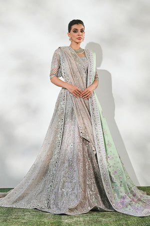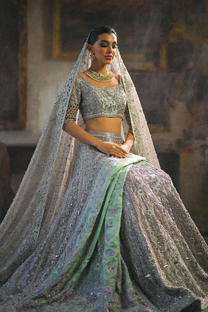 Fairy-like hues take centre stage in this elaborate bridal ensemble. Cut from a metallic tissue, this lehnga and choli have a uniquely light shade of lilac. The set is embroidered with cool toned zardoze details and are accented with mint and lilac resham flowers. Cutwork details adorn the fully embellished gossamer sleeves and the back. A matching dupatta, crafted from tissue, has zardoze and resham detailing on its cutwork borders surrounding sequin and pearl bouquets dispersed densely on the length. Paired with a light, mint hued shawl, crafted from the finest self jamawar, hand embroidered with zardoze, resham, aari, and applique details.