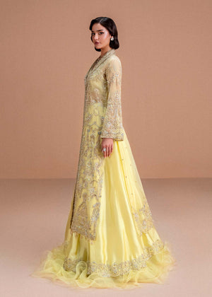 Glow with radiance in this butter yellow ensemble that captures the essence of festive elegance. The statement jacket, designed with a chic shawl collar, is lavishly hand-embellished with intricate detailing that adds brilliant sparkle and dimension. Paired with a matching bustier and a playful silk lehenga featuring soft, cascading ruffles, this outfit strikes the perfect balance between graceful charm and modern flair ideal for making a lasting impression at any celebration.