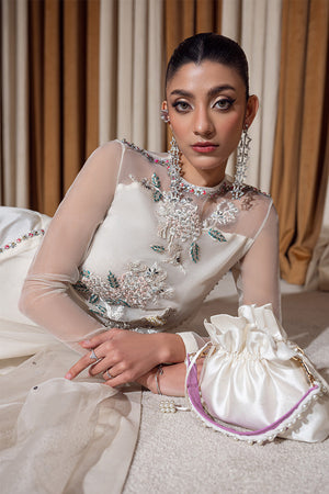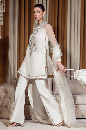 Meow is an attire with an ethereal vibe with its elaborated short shirt on organza incorporating gorgeous beadwork and crystal flowers on the edges. The canvas is accentuated with embellished borders and crystals. The beautiful white hue is completed with an embellished organza dupatta and bootcut pants with worked slit in the front. The signature bird motif enhances the look of the attire to its proper grandeur, with detailing with stones on the edges.