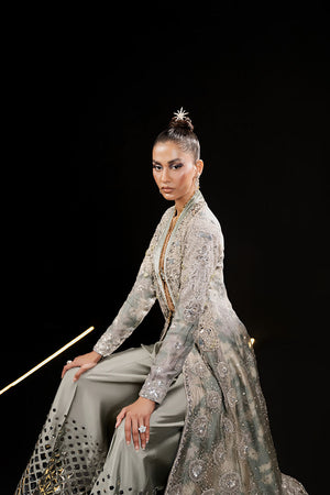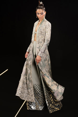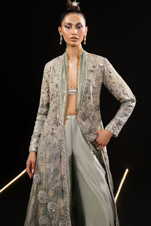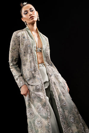 This light sage green ensemble features a front open organza jacket, intricately adorned with dabka naqshi, mukesh work, and striking French knot details in contrasting hues. Velvet patchwork florals, along with a velvet collar adorned with kiran details, bring an opulent touch to the piece. Delicate beadwork, pearls, sequins, and Swarovskis elevate the embellishments, while the tie-dye lining adds depth to the intricate embroidery. Paired with a flared boot-cut trouser made from tissue silk, intricately hand-sewn with leatherette, this outfit is designed to leave a lasting impression.