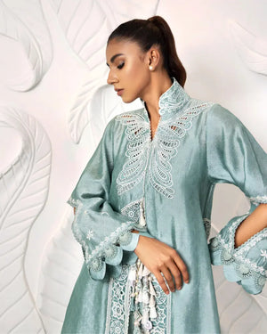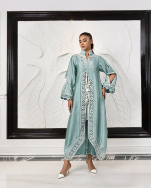 Asymmetric jacket with cutwork embroidered borders defining the lengths. Drape this beautiful jacket done in pure self patterned silk to exude grace and style. the jacket comes with a short (knee length) slip.