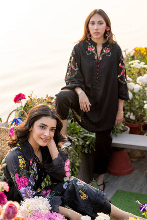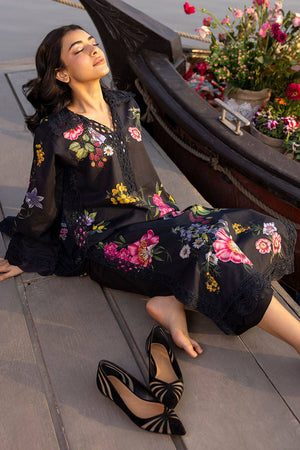 A striking black cotton shirt adorned with vibrant florals, featuring an elegant organza and lace collar, complemented by organza scallops on the hem and sleeves for a refined and chic look