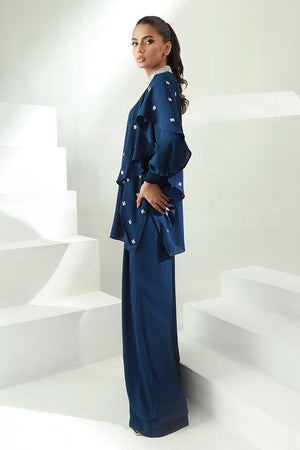 In a rich shade of deep blue, this flared tunic is a work of art. It boasts intricate silver handwork with Kora and stone embellishments. Details like elastic cuff pleated sleeves and flares on the sides give it a timeless and distinctive cut. Completing the ensemble are wide-leg pants, adding to its classic and unique appeal.