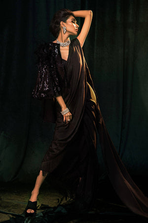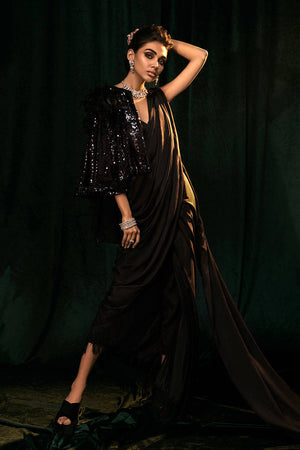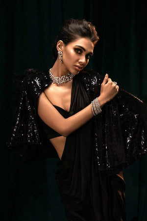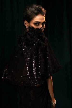 A stunning black silk pants saree with an eye-catching sequence jacket finished with feathers on the shoulders.Jacket Length: 20