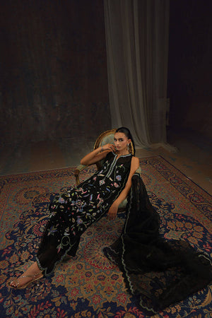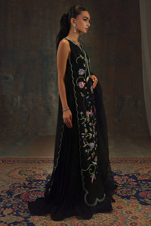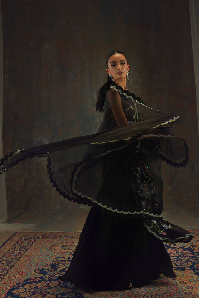 Like a midnight garden in full bloom this ensemble is crafted from lustrous silk. The sleek silhouette serves as a canvas for jewel line hand-embroidered florals, entwined with delicate vines lending to the bold sparkle. The organza dupatta, finished with hand-embroidered scallops and edged in lace, frames the ensemble with airy elegance. can be paired with a crushed lehnga for a more regal, romantic feel, or with wide-leg pants for a modern silhouette. Elegant yet arresting, this is eveningwear where poise meets drama.