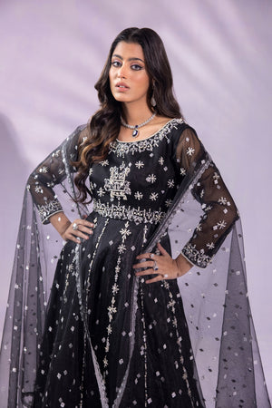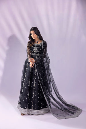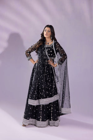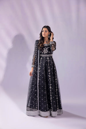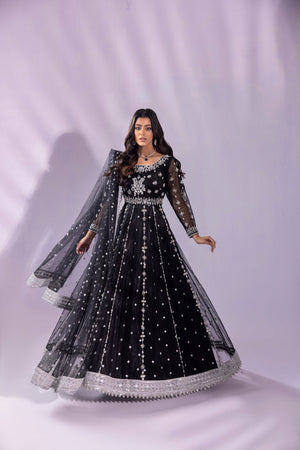 Meticulously designed on net in a long paneled adda work pishwas silhouette, on a black canvas with intricate hand crafted details featuring an silver naqshi, dabka, stones ,pearls hand work embroidered border on the hem . The look is completed with a delicately adorned net dupatta bordered with silver lace. Ready to catch falling stars.
