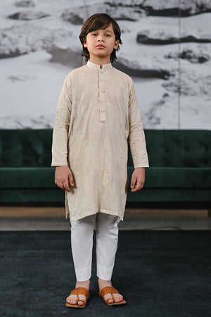 A refined cream cotton kurta with intricate self-embroidery, perfectly paired with crisp white pants. Elevate your elegance effortlessly.