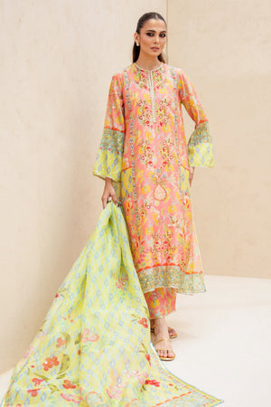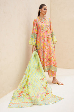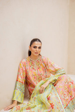An A-line salmon pink cotton net shirt is detailed with intricate floral prints and delicate gota accents, framed by contrasting borders at the hem and sleeves. The straight silhouette is paired with matching printed trousers for a refined finish. A diaphanous lime toned organza dupatta, layered with ikat inspired motifs and scattered blossoms, completes the ensemble with airy elegance.