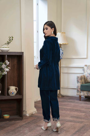 A teal colored velvet with a sharp silhouette, encrusted with Swarovski and sequins in floral patterns, embroidered with tilla work and cut work design on sleeves ad embroidered handwork on cigarette trousers.