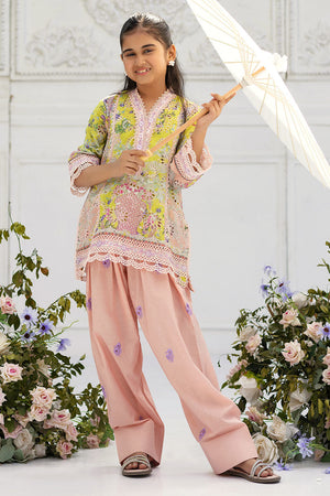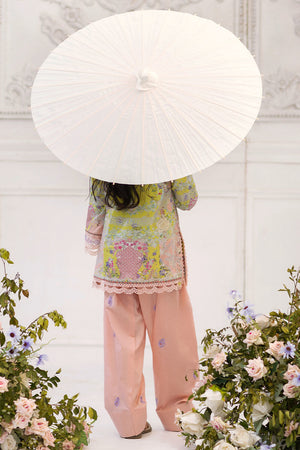 Vibrant and festive, this lime and pink short frock is adorned with playful tila patti work on the bell sleeves. Paired with a traditionally inspired farshi shalwar and a soft organza-paneled dupatta, this look brings a lively splash of color to any occasion.