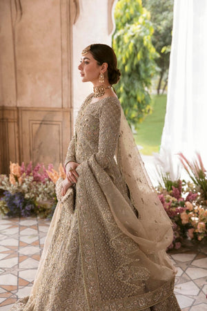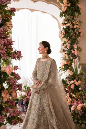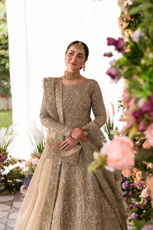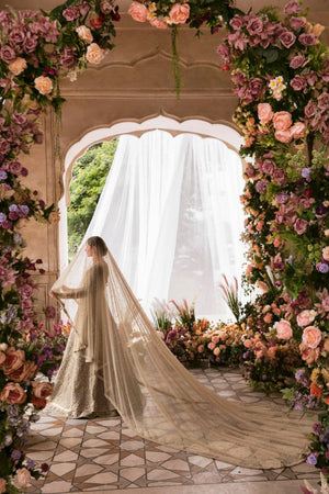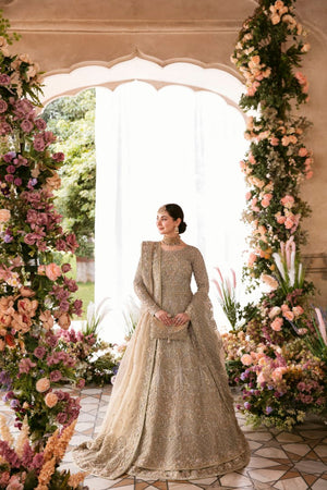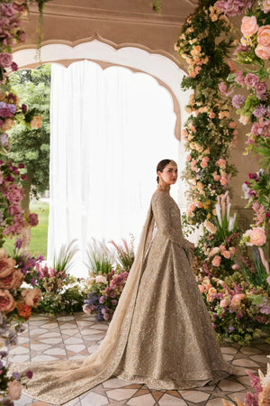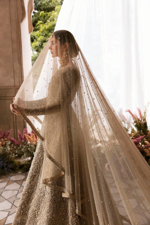 Minha is all about delicacy personified on a nude colored organza pishwas, which exhibits heavenly embellished geometric and floral patterns, adorned with rich, magnificent details. Paired with a self jamavar lehanga, with fully embellished exquisite border along with delicately paired with organza dupatta with four sided embellished border and extended pallu and booti spray. Moreover, a beautiful light champagne luxe net veil with pearls spray and four-sided intricate border has been added to give a goddess look to the outfit.Pishwas: Organza