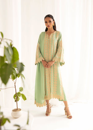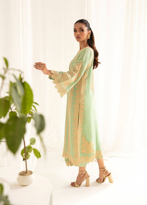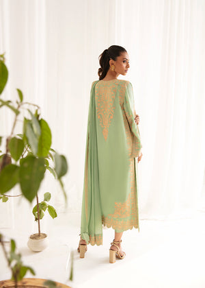 Mint Elegance embodies a slit open pure grip shirt; adorned with intricate work. It is a true masterpiece. The mint green palette brings a refreshing touch to the ensemble, while the delicate embroidery of the chiffon dupatta along with fitted pants complete the look with absolute finesse.