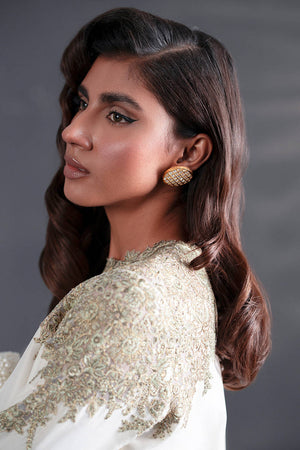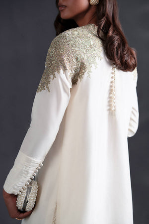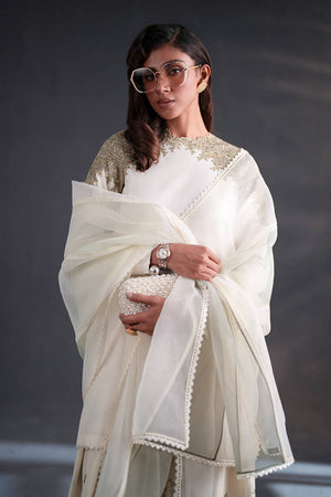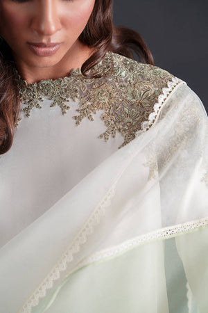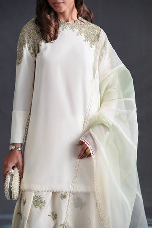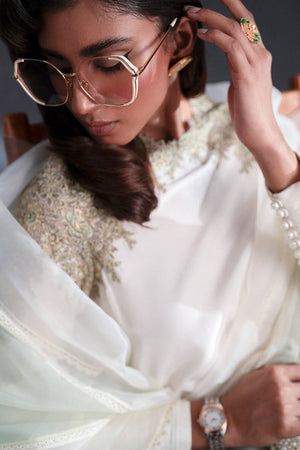 A study in graceful minimalism, this white kameez is punctuated by ivy-like embroidery that climbs organically across the neckline and shoulders in shades of olive green. The blank expanse of the shirt allows the embroidery to shine, making it ideal for both day and evening wear. Wide-leg trousers are scattered with sprigs of embroidered florals, their hem trimmed with delicate lace. The dupatta, crafted from sheer organza, features shimmering lace borders, adding an air of lightness and whimsy.