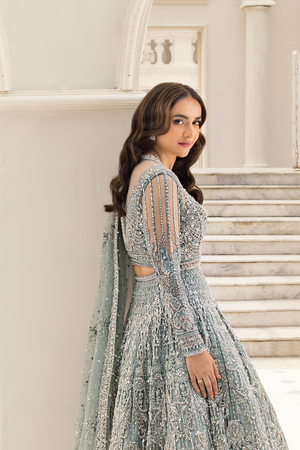 Richly crafted in traditional techniques, this mint green lehnga choli is the embodiment of utmost charm. Detailed in zardozi craftsmanship giving a glamorous look for bride, this ensembles with addawork on net dupatta to add the regality any bride is looking for!