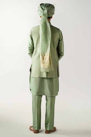 This regal Olive Green ensemble features an Indian Silk waistcoat adorned with Achor embroidery, patch accents, and refined Adda work. A distinguished piece for the groom or a close family member — perfect for a dignified Nikkah appearance.