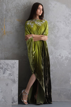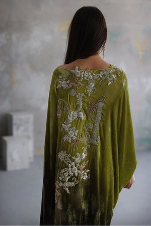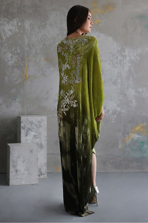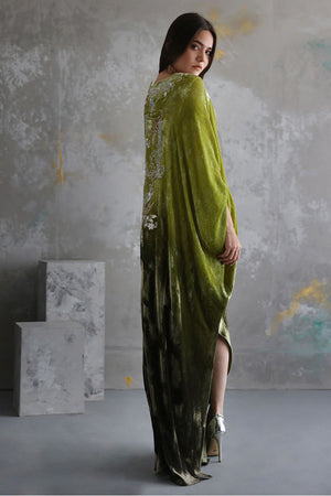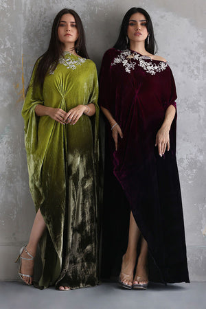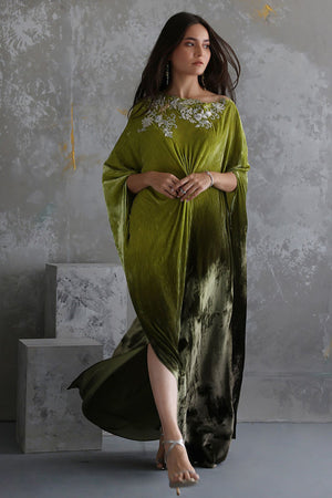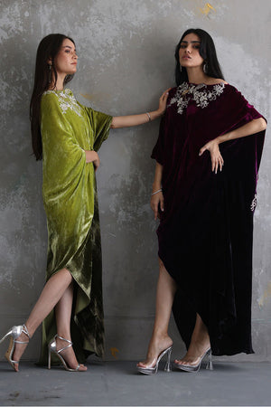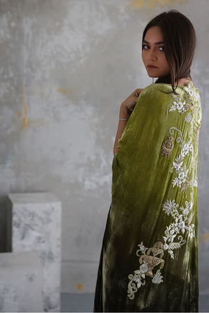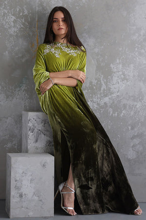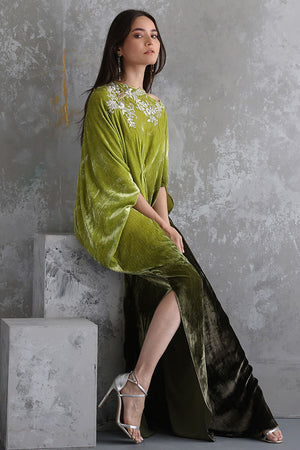 A beauteous free fall pure velvet off shoulder Kiwi color in ombre style kaftan stands out in the crowd. The exquisite embroidery around the front neckline and all over the back comprises of zari, stones, dabka, naqshi and sequins is worth buying.