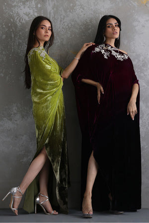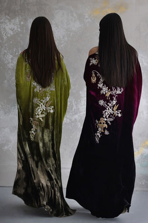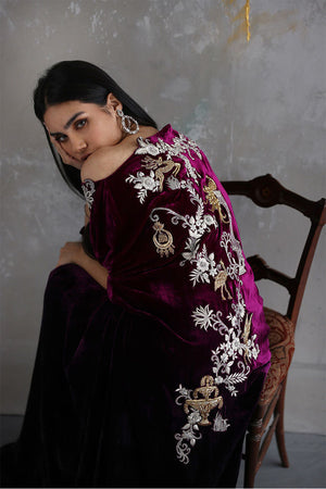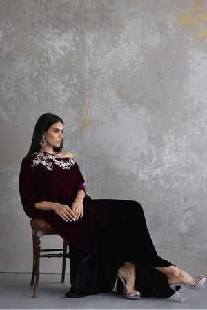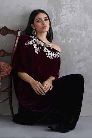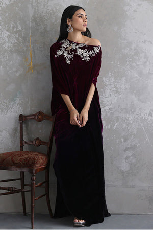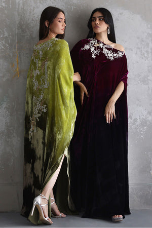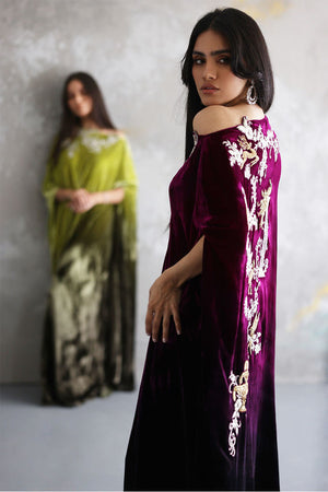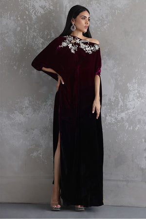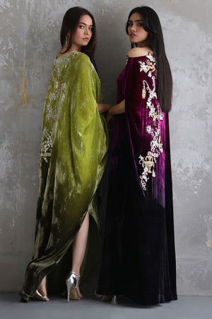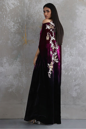 A beauteous free fall pure velvet off shoulder Deep Orchid color in ombre style kaftan stands out in the crowd. The exquisite embroidery around the front neckline and all over the back comprises of zari, stones, dabka, naqshi and sequins is worth buying.