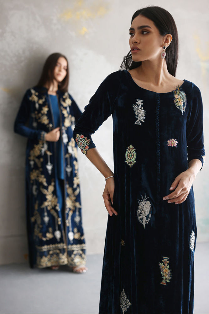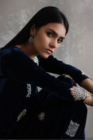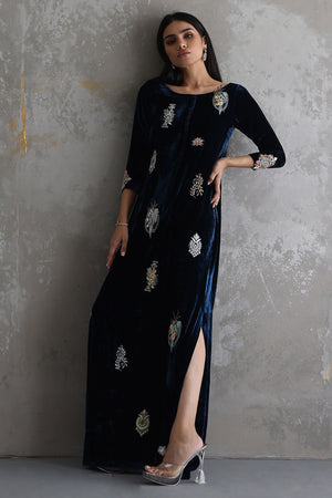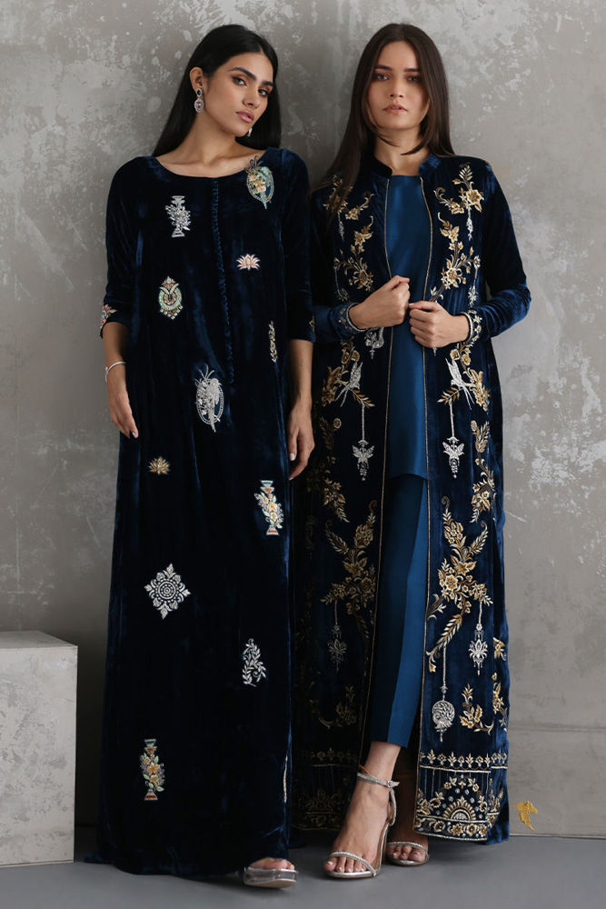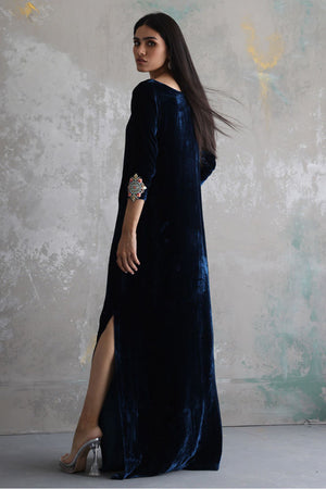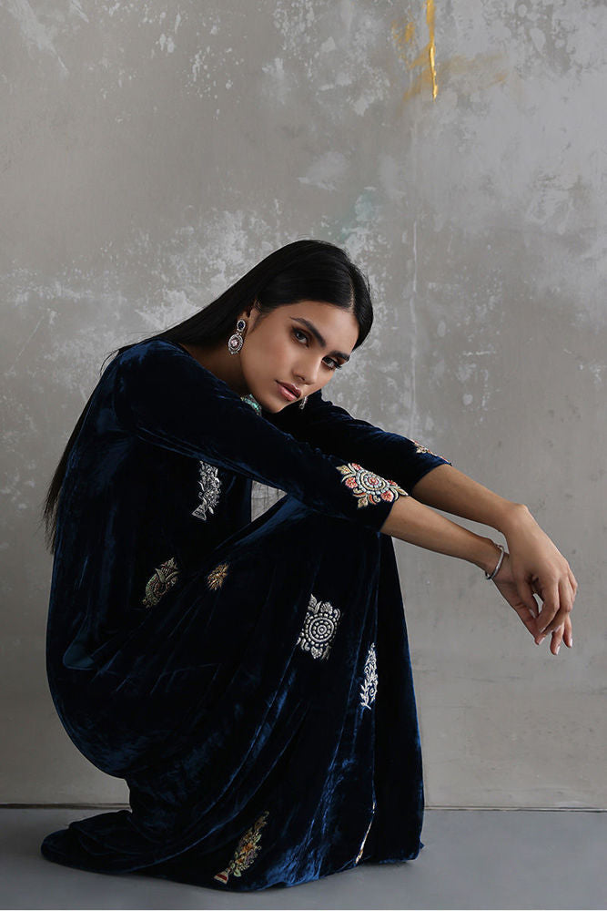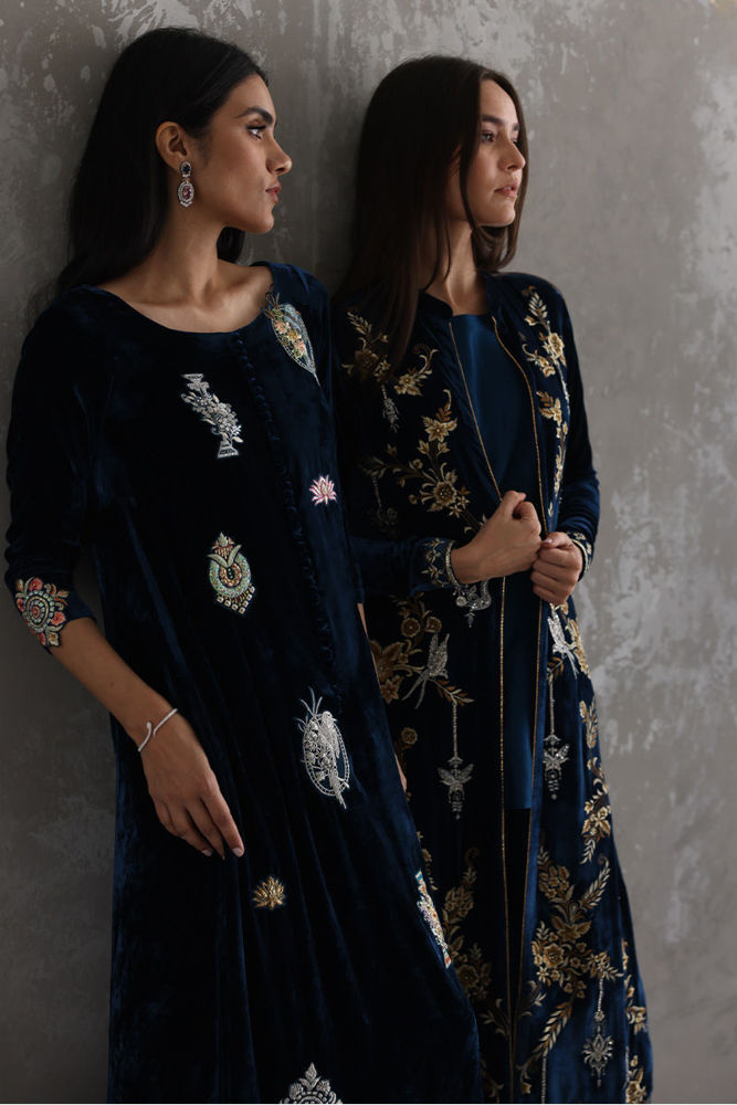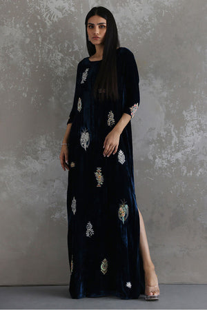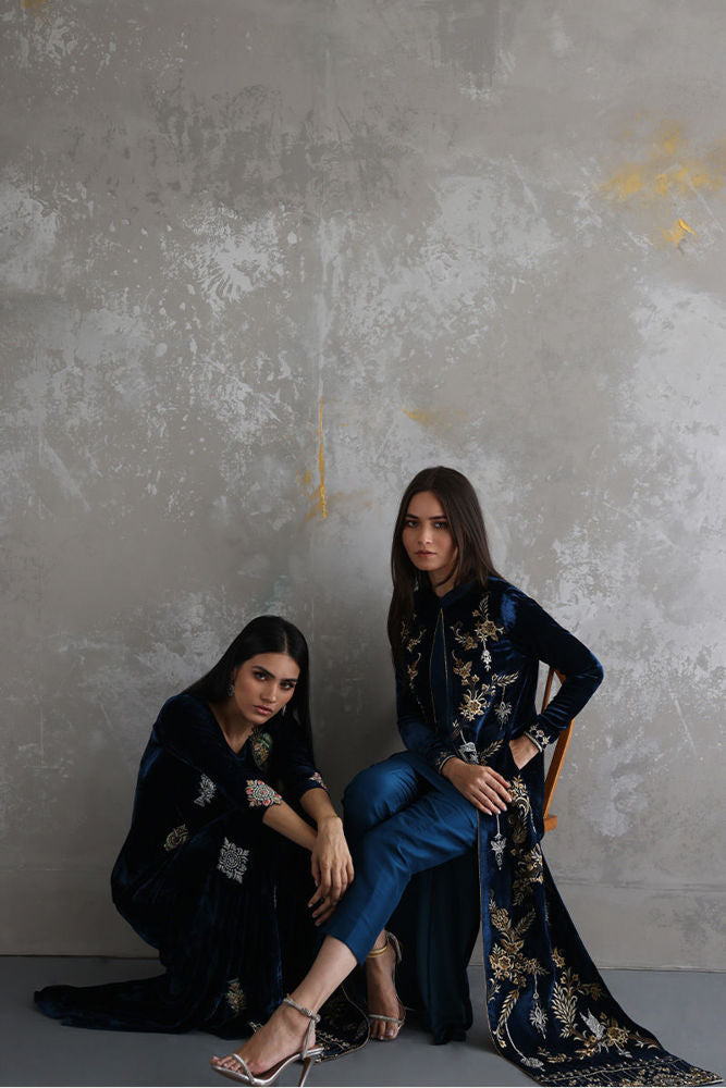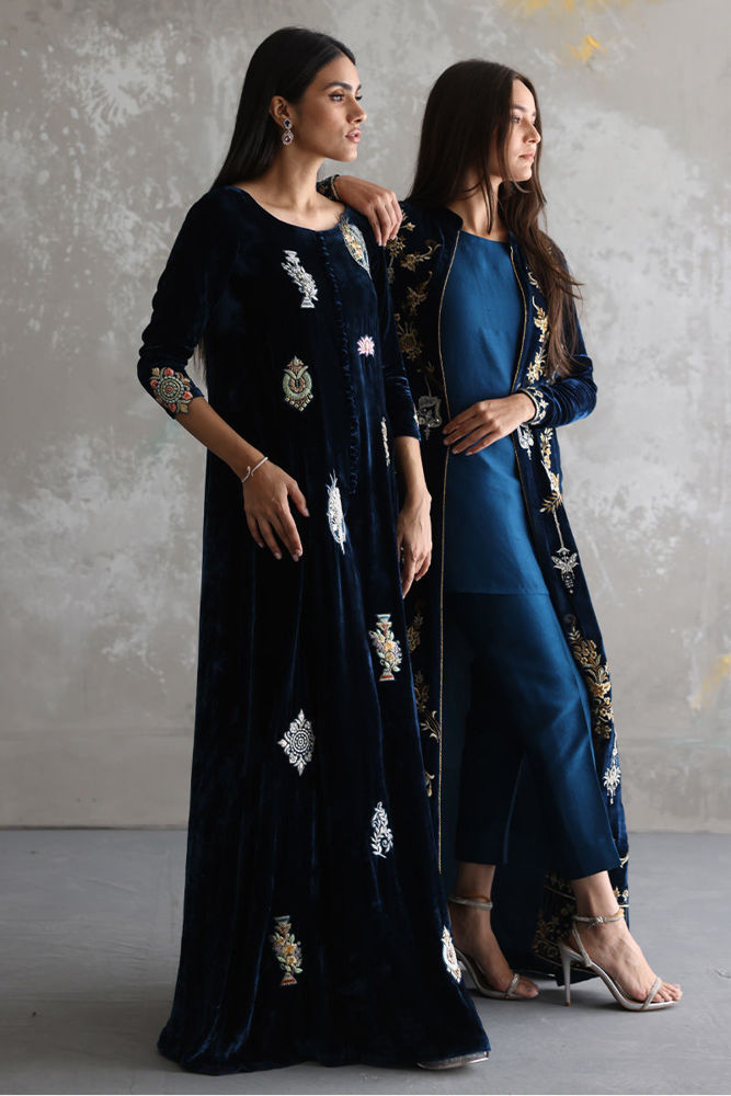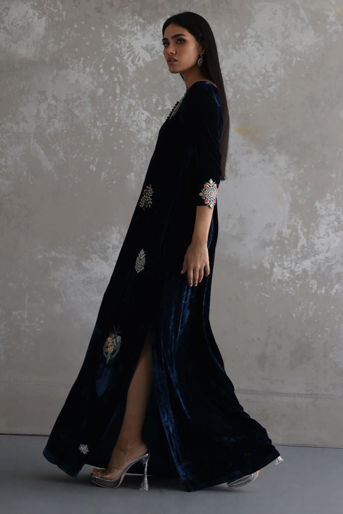 Teal Blue coloured long Straight Kaftan in pure velvet is a perfect attire for a classy winter evening. This beauty is carefully crafted with resham, zari, stones, dabka, naqshi, sequins and cutdana. To create a trendy look pocket has been given on one side where as slit is shown on other side.