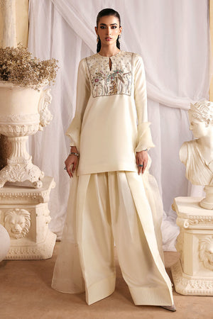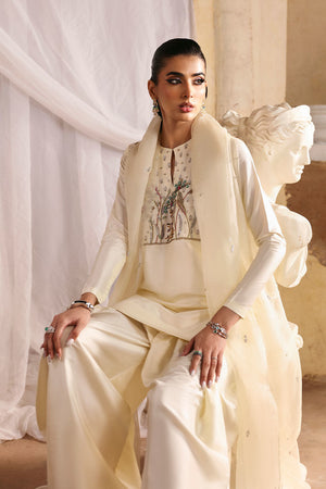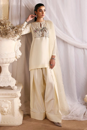 Discover understated elegance with our off-white ensemble featuring a Korean raw silk shirt and shalwar, paired with a graceful pure organza dupatta. This refined outfit seamlessly blends classic charm with modern sophistication.