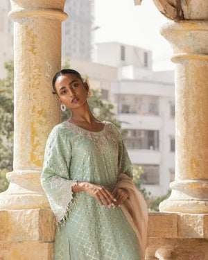A statement outfit in silk khadi net, where masterful handwork with zardosi and kamdani creates an aura of timeless beauty and craftsmanship.