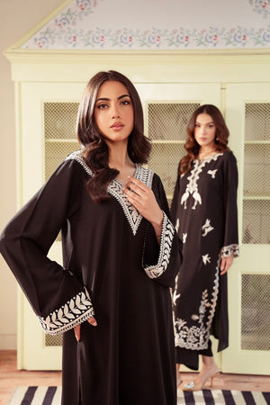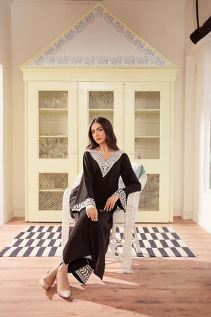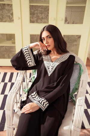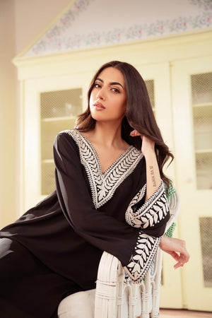 A classic black ensemble with detailed compositions of white and black thread work. It is paired with a culotte which features intricacies of crafted hand-aari work, making a striking ensemble for Fall.