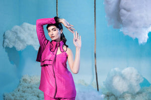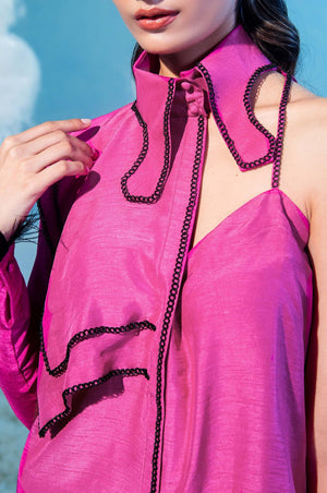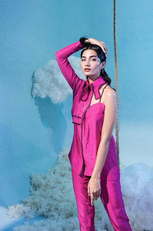 Elevate your style with our Mirage matching set, featuring a striking fusion of fuschia pink and black. This 2-piece ensemble boasts an unconventional, hand-embellished collar design adorned with intricate black mini chains, adding a touch of edge to timeless elegance. The ensemble features a sleeveless top on one side and a fitted, feather-embellished sleeve on the other, creating a unique asymmetrical silhouette. Paired with our fuschia cigarette pants, adorned with delicate feather lace at the hem, this set is a statement in sophistication and style. Note: For length and sleeve customizations, please drop a message on our instagram page or whatsapp number for our fashion guide to help you!