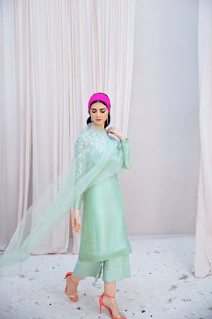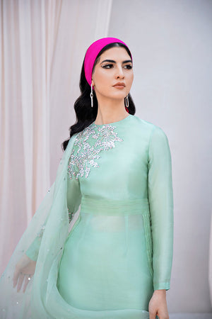 Details: Mint Colored Pleated And Body Cut Shirt With Asymmetric Hand