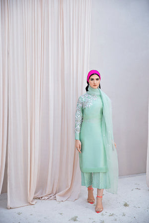 Details: Mint Colored Pleated And Body Cut Shirt With Asymmetric Hand