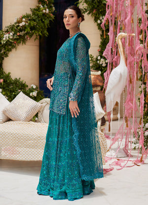 Miral, a name that evokes the blush of dawn, embodies the very essence of ethereal elegance. The centerpiece of this captivating ensemble is a front open hand embellished net short shirt, crafted from the finest net. Its luxurious texture, draped in a stunning teal, flatters the form like a blossoming rose. Silver zardozi work, like moonlight catching on dewdrops, dances across the fabric. Each stitch is a testament to generations of artistry, whispering tales of heritage and tradition.