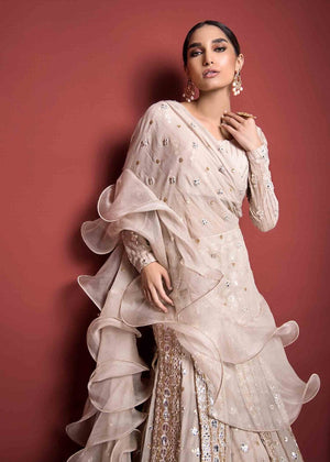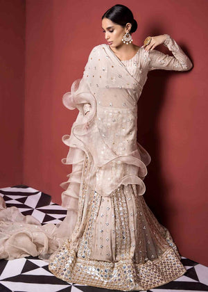 This beautiful champagne hand-worked set featuring delicate Chikan kari work. Paired with an eccentric ruffled dupatta. Handcrafted with meticulous care, this piece has a lot of diligence and love invested in it.The shipping charges for all articles barring Bridals are as follows: